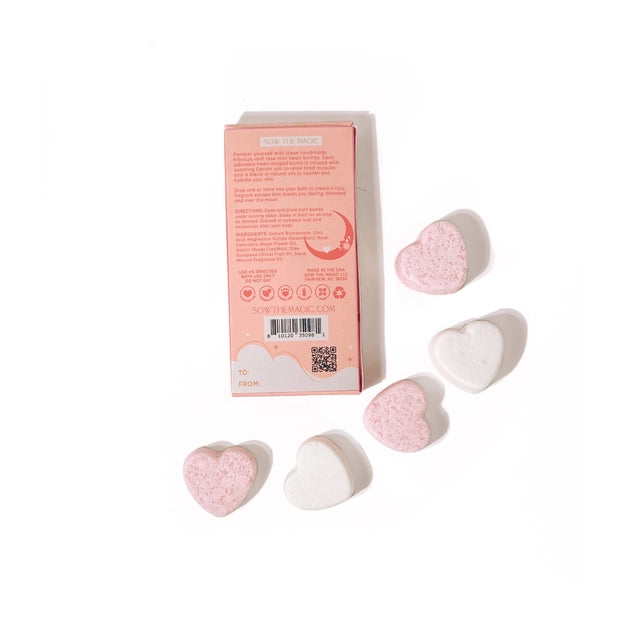 Handmade mini heart bombs infused with soothing Epsom salt to relax tired muscles and a blend of natural oils to nourish and hydrate your skin.