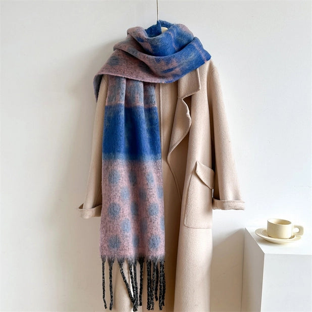 Soft brushed woven scarf featuring color block patterns with finished fringe ends. 100% recycled polyester and extra long measuring 86.5"x16.5"